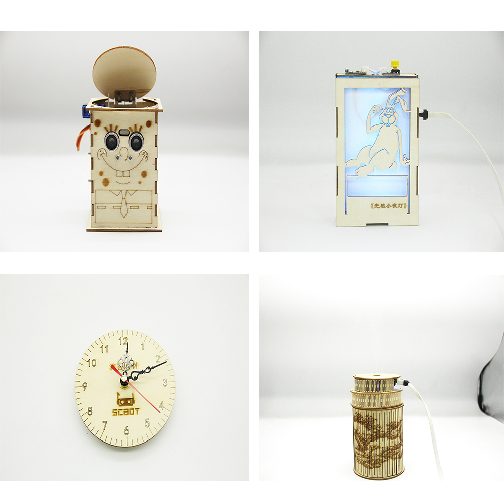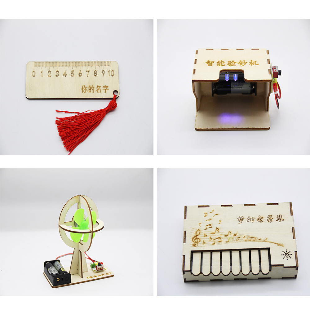 激光切割機(jī)電子設(shè)計(jì)套件的配套教材是根據(jù)套件本身的內(nèi)容進(jìn)行編寫(xiě)的,以幾何數(shù)學(xué)的角度結(jié)合簡(jiǎn)易的電子設(shè)計(jì),使得老師與學(xué)生能夠以數(shù)學(xué)思維的角度去看待切割機(jī)的建模設(shè)計(jì),能夠讓學(xué)生與老師玩轉(zhuǎn)激光切割機(jī)并進(jìn)行不同的DIY項(xiàng)目設(shè)計(jì),促使學(xué)生進(jìn)行平面、結(jié)構(gòu)以及機(jī)械傳動(dòng)等方面的創(chuàng)作,從而引導(dǎo)學(xué)生進(jìn)行基礎(chǔ)知識(shí)的物化、簡(jiǎn)易電路知識(shí)的運(yùn)用、幾何思維的培養(yǎng)以及創(chuàng)新造物能力的提高。