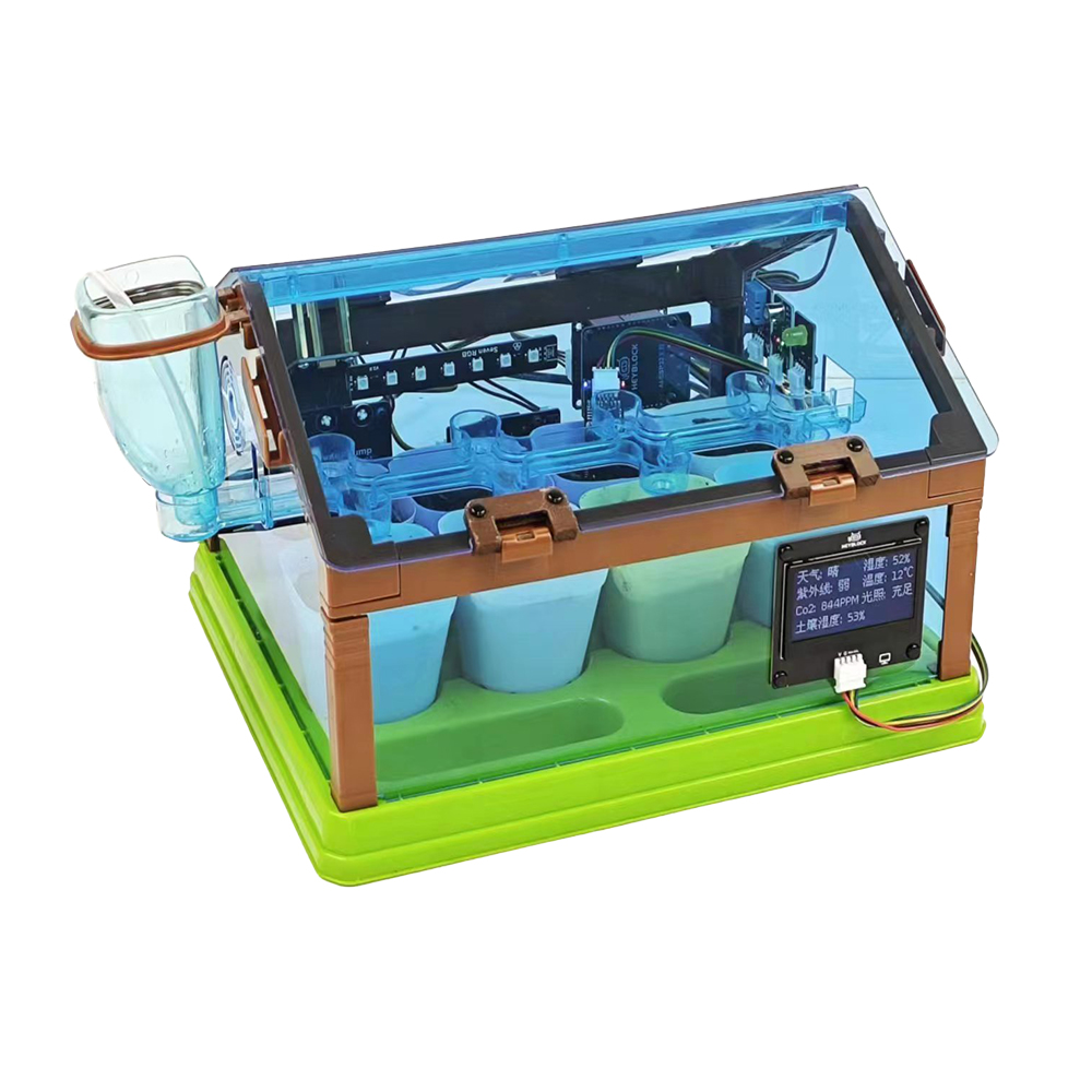 2、AI智慧農(nóng)場可根據(jù)圖形化編程可實現(xiàn)相應(yīng)的功能:第一,農(nóng)場環(huán)境檢測功能,包括CO2、土壤濕度、光照強度、溫度、濕度、雨水等環(huán)境參數(shù)監(jiān)測,同時還能一起將環(huán)境參數(shù)實時顯示在2.4寸OLED屏幕上;第二,能根據(jù)土壤濕度檢測的數(shù)值參數(shù)進行自動滴灌補水、根據(jù)光照強度進行室內(nèi)自動不光、根據(jù)室內(nèi)濕度情況進行自動排風(fēng)等功能;第三,AI智慧農(nóng)場還可利用手機APP進行遠程交互控制,包括在手機APP查看當(dāng)前農(nóng)場環(huán)境參數(shù),并利用手機APP對農(nóng)場進行相應(yīng)的功能控制,包括補光、補水、排風(fēng)等。